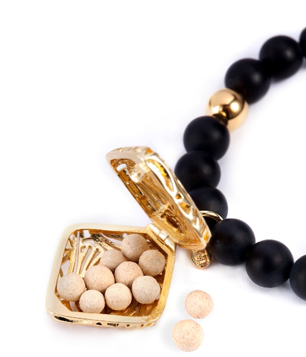 Open the charm from indentation or seam. Fill charm with fragrance beads, then snap closed.
